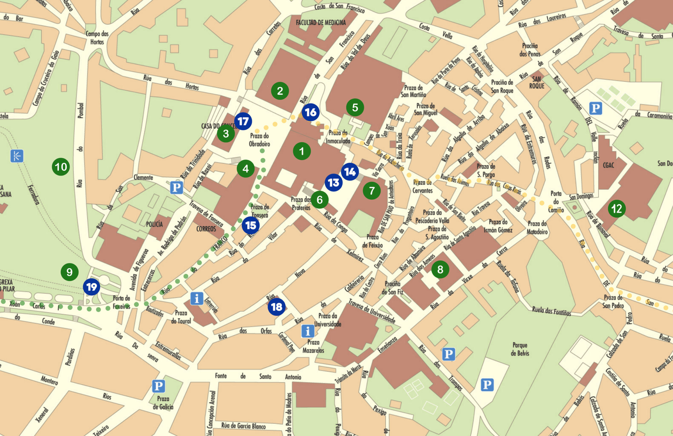 Here is a map of the must see sights in Santiago de Compostela. We have also featured some selected unusual sights in town. You can click on the image to enlarge it.