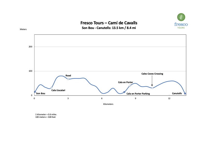 After lunch, we continue for another 5 kilometers to Canutells. The first section is more challenging, with some rocky ascents and descents. The second section is more relaxed, offering beautiful panoramic views of the island’s interior. The arrival at Canutells is a treat, with a lovely beach perfect for dipping your feet in the water.