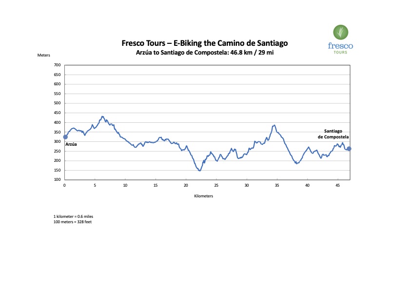 Today is the big day – we’re arriving in Santiago! We continue our journey along winding roads through rural Galicia, and before we know it, we’ll reach the outskirts of the city – a sudden contrast after days of cycling through peaceful countryside. However, the very last part of the Camino goes through the older quarters of the city and the historic district, which have not changed much in over 150 years.